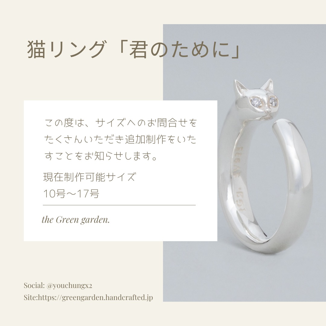 猫リング「君のために」のサイズのお問合せが多く、制作サイズのラインナップを追加いたします。